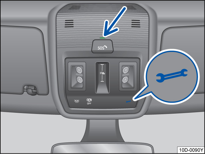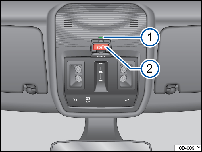 eCall 紧急呼叫系统默认为启动状态。操作元件位于顶篷中控台中。
