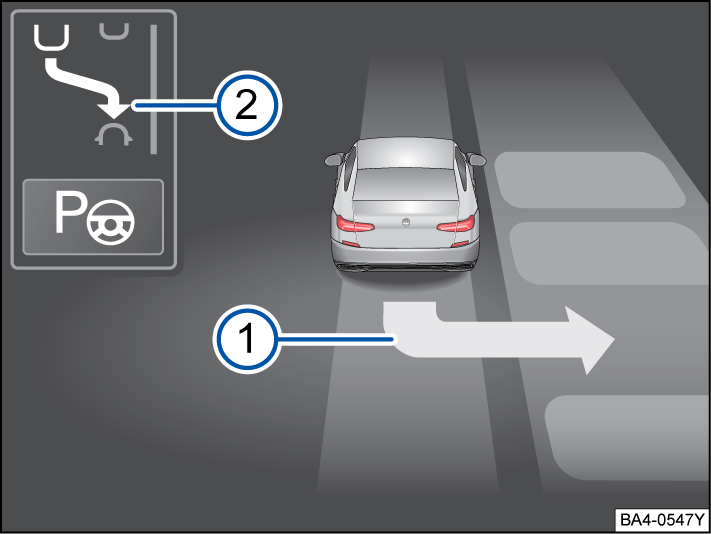 开启智能泊车辅助系统后,在辨识到停车位时,会在组合仪表显示屏上提示建议的驶入模式。智能泊车辅助系统自动选择停车模式。所选停车模式显示在组合仪表显示屏上(见图 3 ①)。其他备选停车模式显示为迷你显示概览图(见图 3 ②)。如果智能泊车辅助系统的选择结果与所需停车模式不符,则可再次按下按钮