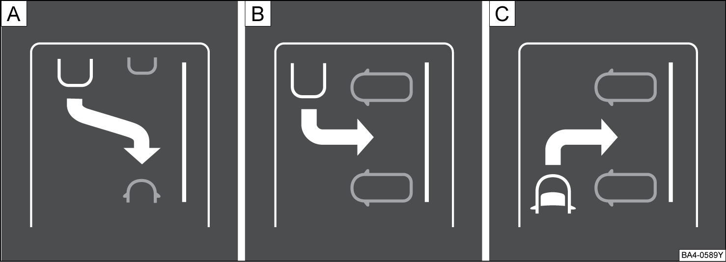 图 2 停车模式迷你显示概览图:A 向后纵向驶入,B 向后横向驶入,C 向前横向驶入