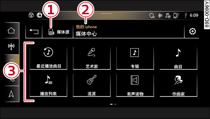 ► 适用于 MMI:在显示屏上选择:媒体 > 媒体源 > 一个媒体源 > 一个类别。