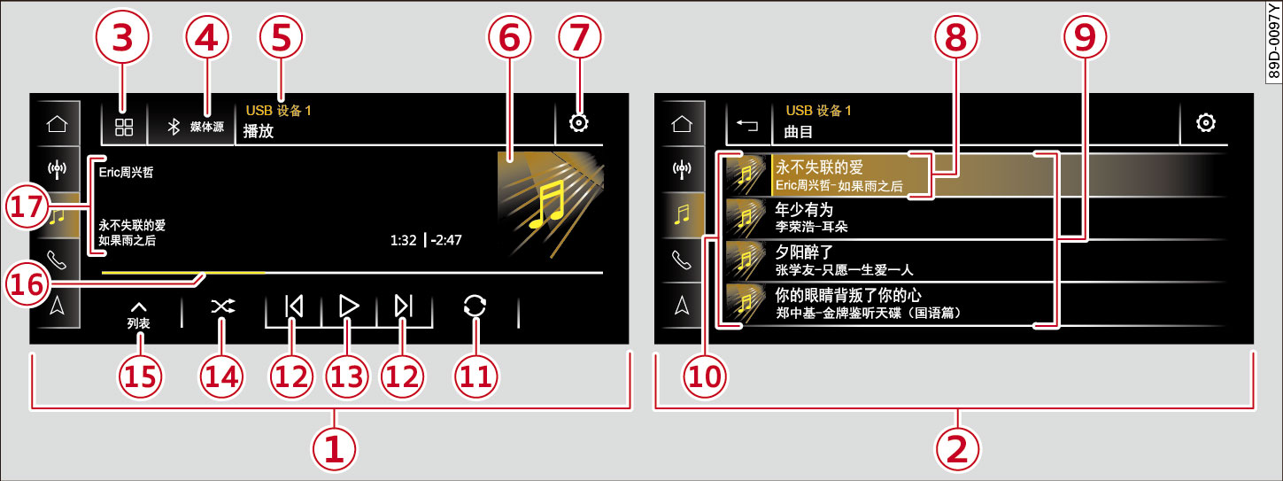 8 | 当前曲目的信息 | 曲目和演唱者显示。当前播放的曲目有色标。 |