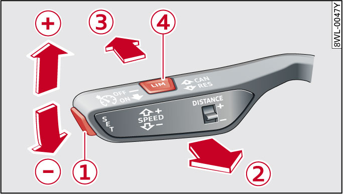 ► 要切换使用定速巡航装置或自适应巡航控制系统和限速装置时,请在操纵杆上按按钮(见图 1 ④)。